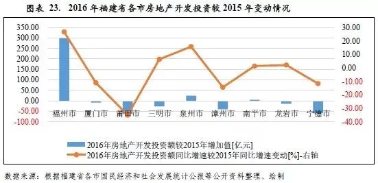 从增速来看,2016年福州市、泉州市和南平市房地产开发投资额增速分别为21.6%、3.6%和3.3%,保持较好的增长态势,但受宏观房地产市场调整影响,福建省其他各市房地产开发投资增速均呈现不同程度的下降。其中,莆田市、三明市和宁德市同比增速分别为-15.1%、-19.9%和-24.8%,降幅较大。从增速变动情况看,福州市和泉州市2016年房地产开发投资额同比增速较2015年分别提高26.7和15.8个百分点,区域房地产开发景气度持续提升。厦门市、宁德市、漳州市和莆田市四市增速均较2015年呈现大幅下滑,其中房地产开发热度较高的厦门市2016年房地产投资增速为-1.1%,较上年下降了11.0个百分点,主要系受土地供给限制,房地产新开工项目缩减。