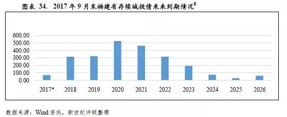 从省本级城投债存续情况看,2017年9月末福建省省本级城投债存续余额为543.50亿元,与2016年省本级一般公共预算收入270.49亿元相比,规模偏大,但得益于大规模的上级补助收入(2016年为1067.91亿元),福建省省本级城投债偿付压力总体可控。