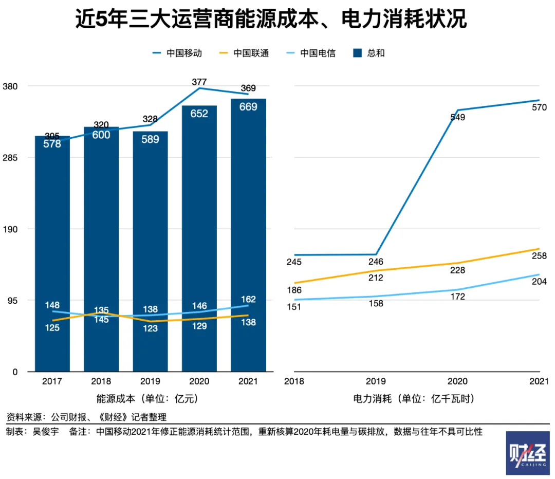 2021年中国移动的用电量为570亿千瓦时,中国电信为204亿千瓦时,中国联通为258亿千瓦时。与之相对应的则是高昂的能源和电力成本,2021年中国移动的能源电力成本为369亿元,中国电信为162亿元,中国联通为138亿元。