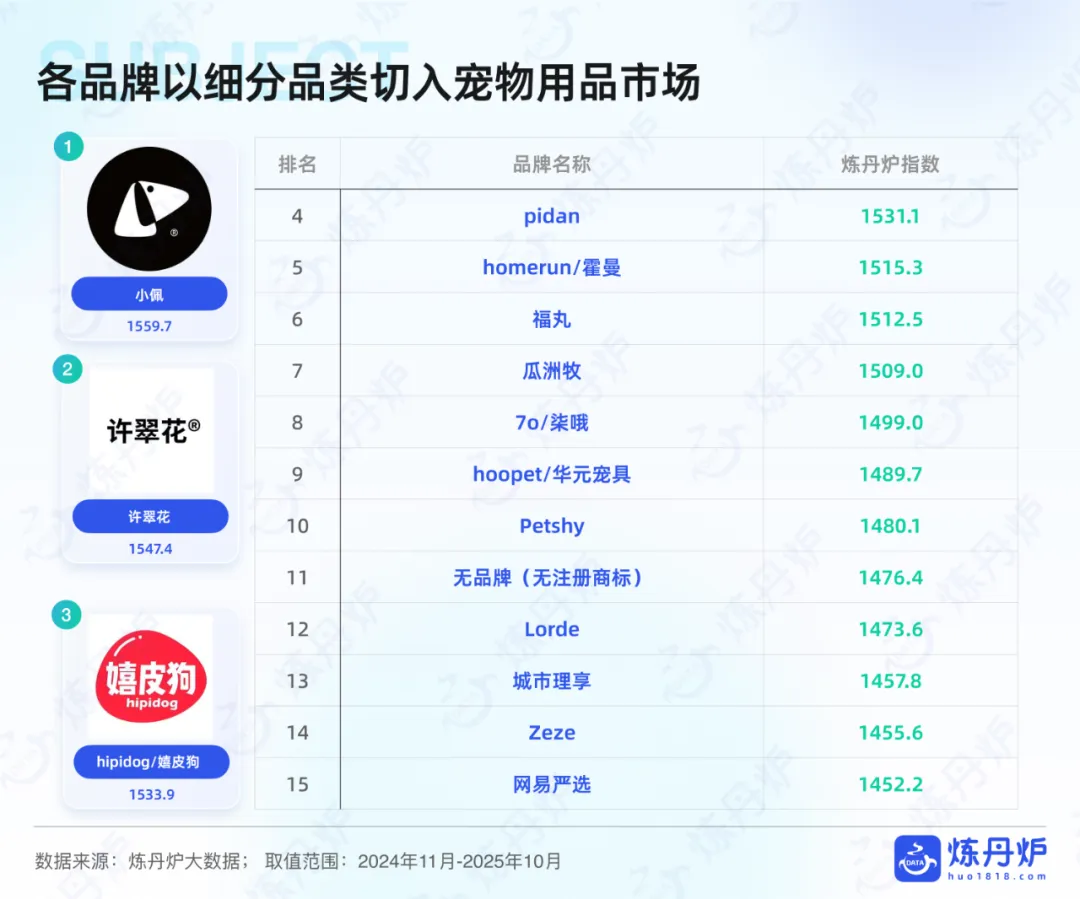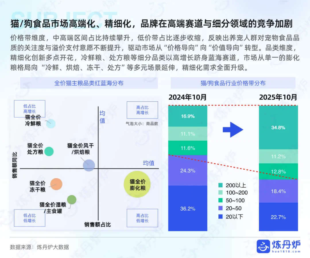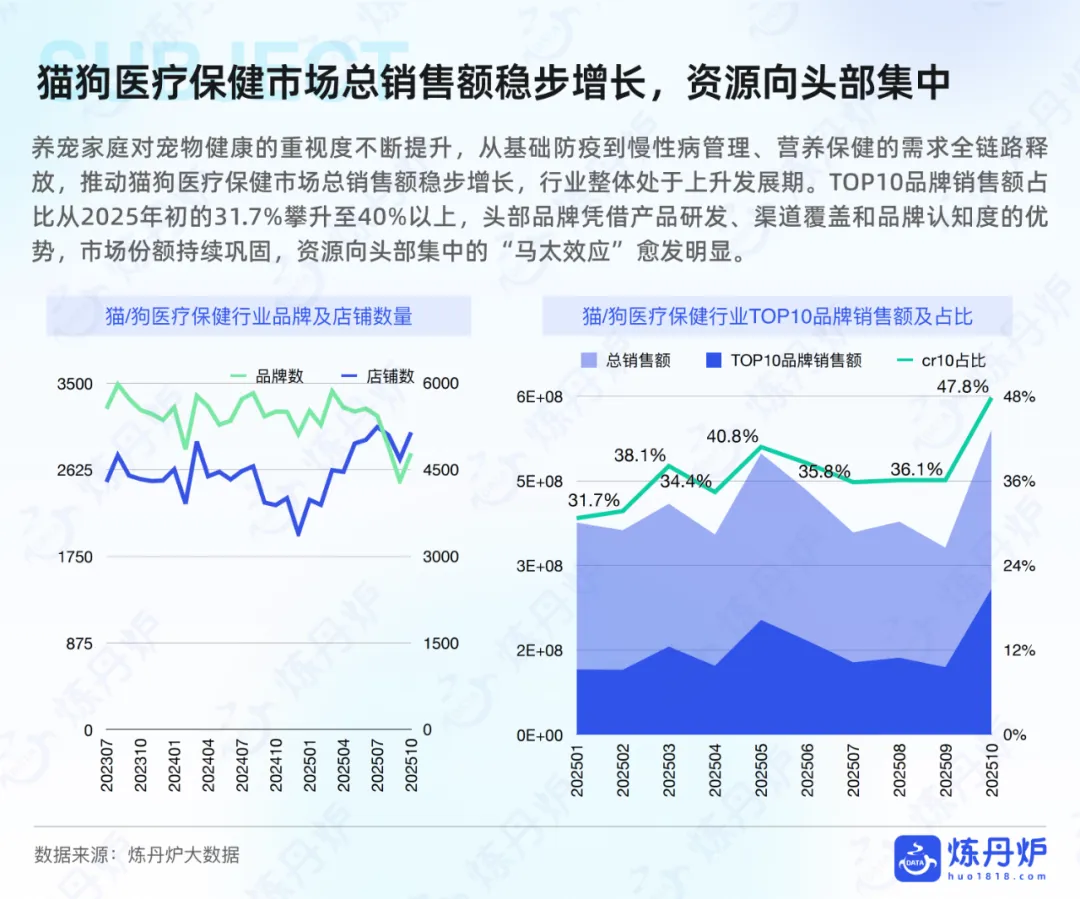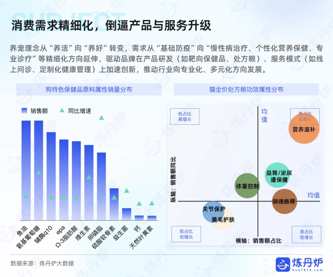 食品赛道是规模最大的,销售额占比38.3%,头部集中度不算低,前十大品牌占比达46.6%。机会主要在高鲜肉、0肉粉、烘焙粮这些细分品类,还有全价格带覆盖的布局,用试吃装拉新、核心装留存的模式很有效。用品赛道则比较分散,前十大品牌占比仅19.7%,智能养宠设备是核心机会点,比如智能喂食器、自动猫砂盆,还有设计驱动的居家用品,中小品牌靠差异化设计比如IP联名猫窝,就能切入人宠共居的细分场景。医疗保健赛道需求刚性强,头部集中度高,前十大品牌占比47.8%,机会集中在处方粮和特色保健品上,像肠胃调理、低脂、泌尿健康等功效型处方粮很受欢迎,而兽医临床经验这类专业化背书,是建立消费者信任的关键。