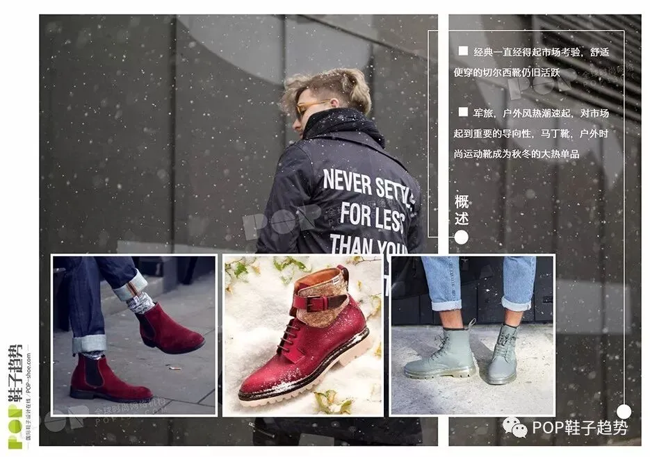 经典一直经得起市场考验,舒适便穿的切尔西靴仍旧活跃,军旅,户外风热潮速起,对市场起到重要的导向性,马丁靴,户外时尚运动靴成为秋冬的大热单品。