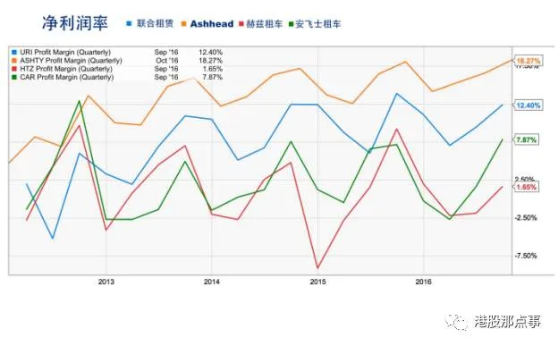 设备租赁行业的对照公司选取之前提到的英国龙头Ashtead Group,而租车行业的对照公司选取美国市场的龙头赫兹租车(Hertz,NYSE: HTZ )与安飞士租车(Avis Car Rental,NASDAQ: CAR )。这些公司都非常专注于主业(赫兹集团刚在去年分离出了旗下的设备租赁业务),所以比较起来至少会有一定的说明力。