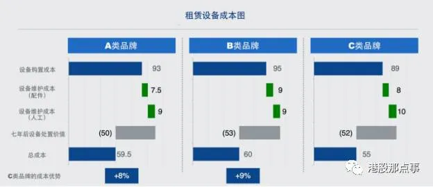 当然联合租赁采购设备的成本其实远不到设备的市场价格,因为大多数设备在租赁若干年之后都会被处置掉,从而收回一部分成本。根据公司的设备管理报告,其采购设备可分为三种类别:A类、B类和C类。即使是成本最高的B类,实际持有该类设备的总成本也仅仅是采购与维护成本的60%而已。