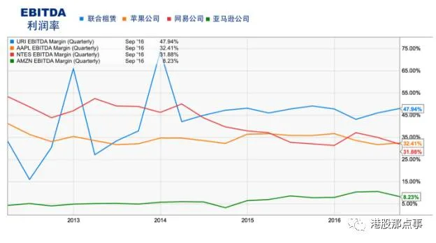 当然,我在这里夸张了,不是每一样东东都是电锯惊魂,联合租赁的净利润率与资本回报率虽然不错,但还远没有到神乎其神的地步。联合租赁身上真正最遗世独立的那一朵奇葩,是她的EBITDA利润率。我们可以将其与前文里出场过的那几个大牛股做个对比,来感受一下。