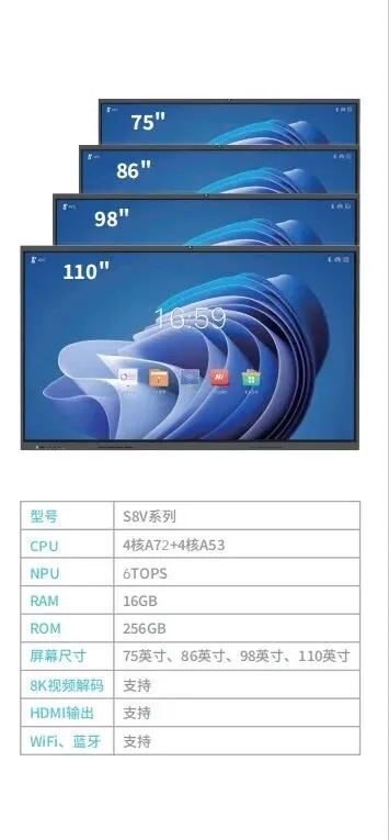 其中,梦派S8系列AI会议白板,以16GB+256GB的大内存组合,匹配6TOPS算力,精准匹配中小企业会议室高频需求。65-110英寸的尺寸,覆盖满足20至100平方的会议室,适合10至50人中型会议场景。