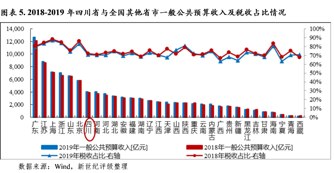 与财政收入相比,2019年末四川省政府债务余额是2019年全省一般公共预算收入的2.6倍,与各省市平均水平基本持平;考虑到政府性基金预算收入和国有资本经营预算收入,当年末四川省政府债务余额是上述三项收入合计的1.3倍。
