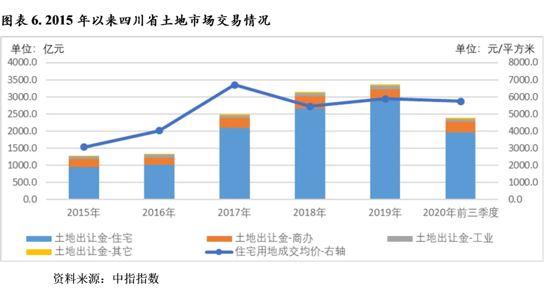 土地市场方面,近年来,四川省土地市场行情走高,土地成交总价持续增长,为全省可支配财力提供较有力支撑。2019年及2020年前三季度,全省分别实现土地出让成交总价3358.1亿元和2383.0亿元,同比增速分别为6.9%和4.4%,其中住宅用地成交总价分别为2905.0亿元和1956.0亿元,同比增速分别为9.3%和-1.6%。同期,全省住宅用地成交均价为5893.5元/平方米和5739.9元/平方米,受出让土地区位差异等因素影响,出让均价小幅波动。