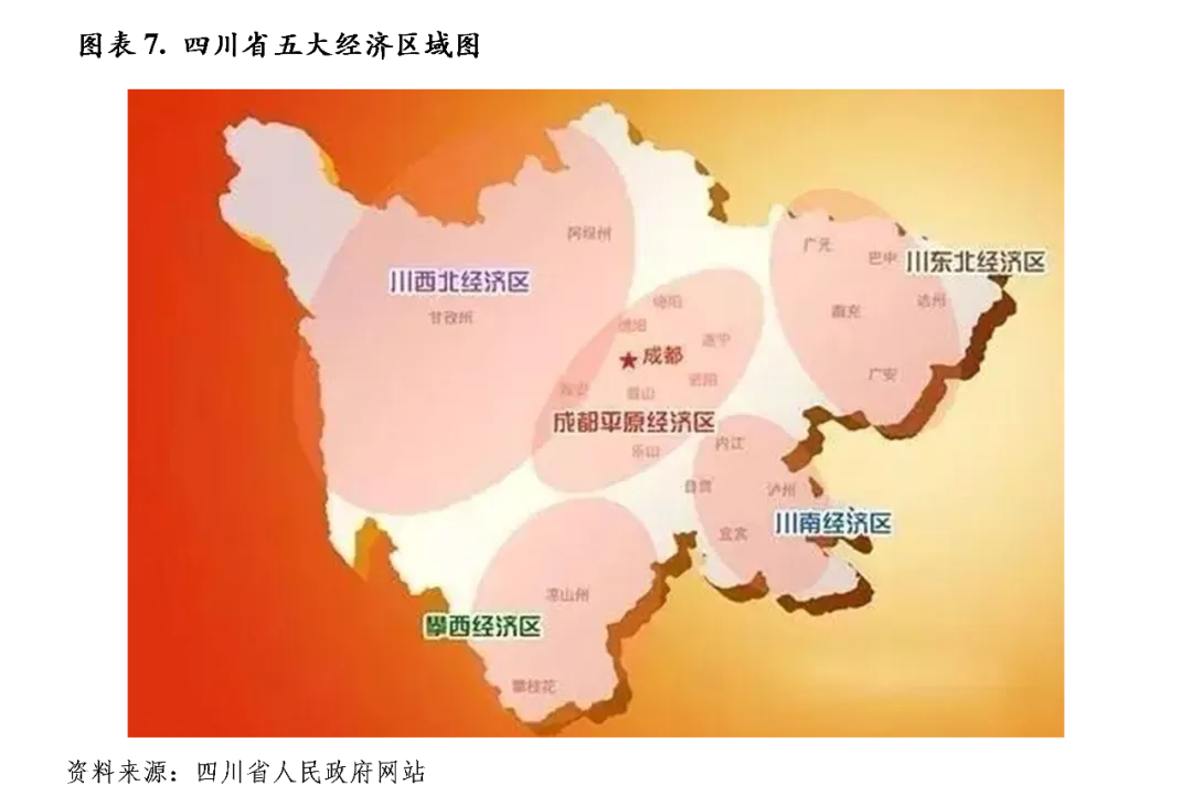 在区域发展方面,2018年6月的四川省委十一届三次全会提出实施“一干多支”发展战略,对内形成“一干多支、五区协同”区域协调发展格局,对外形成“四向拓展、全域开发”立体全面开发格局。其中,支持“主干”成都建设全面体现新发展理念的国家中心城市(全国重要的经济中心、科技中心、文创中心、对外交往中心、国家西部金融中心、国际性综合交通通信枢纽);环成都经济圈建设与成都有机融合、一体发展的现代经济集中发展区,加快发展以绵阳、德阳、乐山为区域中心城市的成都平原城市群,支持绵阳建设中国(绵阳)科技城,支持德阳打造世界级重大装备制造基地,支持乐山建设世界重要旅游目的地;川南经济区建设南向开放重要门户和川渝滇黔结合部区域经济中心,加快发展临港经济和通道经济,打造全省第二经济增长极,培育壮大以宜宾、泸州为区域中心城市的川南城市群,推动川南一体化发展;川东北经济区以加快转型振兴为重点,培育建设以南充、达州为区域中心城市的川东北城市群,推动嘉陵江流域经济协作;攀西经济区推进安宁河流域和金沙江沿岸农文旅融合发展,支持凉山州创建全国同步全面小康示范州和民族团结进步示范州,支持攀枝花建设川西南、滇西北区域中心城市和南向开放门户;川西北生态示范区和大小凉山地区突出生态功能,重点推进脱贫攻坚,发展生态经济,促进全域旅游、特色农牧业、清洁能源、民族工艺等绿色产业发展。