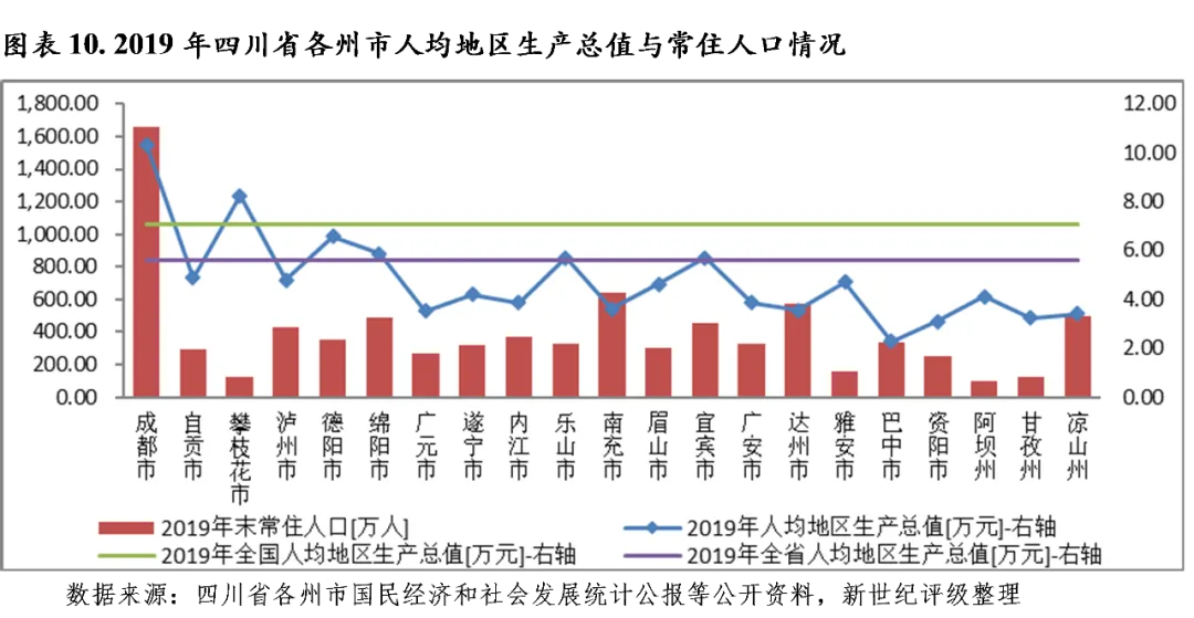 人均GDP方面,2019年四川省人均GDP为5.58万元,同比增长7.0%。各州市中,成都、攀枝花、德阳、绵阳、宜宾和乐山超过全省平均水平,分别为10.34万元、8.25万元、6.57万元、5.87亿元、5.70和5.70万元;巴中、资阳、甘孜和凉山人均GDP不到3.50万元,其中巴中以2.27亿元居全省各州市末位。此外,攀枝花、遂宁、资阳、南充和巴中2019年常住人口呈现净流出状态,其中遂宁已连续三年、资阳连续两年净流出。
