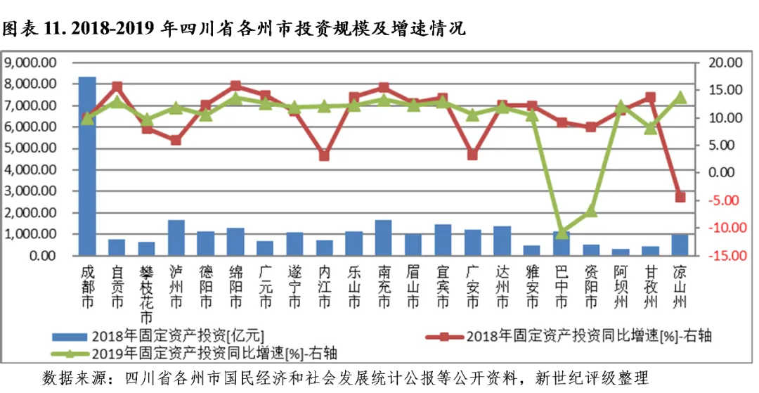 四川省下辖各州市经济发展较不均衡,首位城市经济实力强劲,成都地区生产总值占全省的比重超过三分之一,其余各州市的经济发展水平与其差距愈发悬殊。2019年,宜宾继续保持较高的经济增速,经济规模排序前进一位至全省第三位;泸州和达州经济规模突破2000亿元;资阳经济规模修订后降至千亿元以下。从经济增速看,全省大部分州市经济增长对投资的依赖程度较大,2019年包括成都在内的17个州市投资增速保持两位数增长,对经济的拉动作用显著,而巴中当年以-10.7%的投资增速垫底,当年经济增速下滑较明显。2020年前三季度,全省各州市经济在投资拉动下企稳回升,宜宾经济增速继续保持在全省首位,甘孜、广安、德阳和巴中固定资产投资增长缓慢,上述区域投资稳增长压力较大。