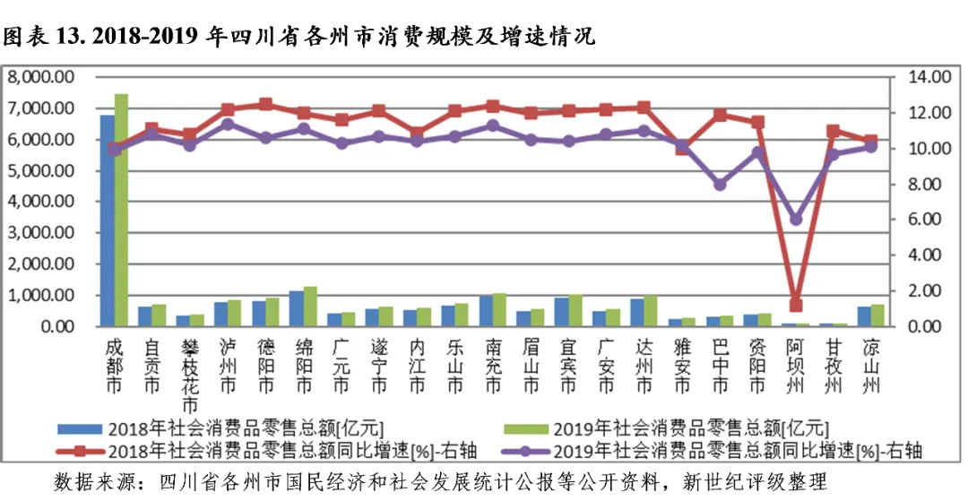 消费方面,2019年四川省各州市社会消费品零售总额均保持增长,除阿坝和巴中外,其余各州市消费增速差异不大。其中,成都实现社会消费品零售总额7478.40亿元,占全省社会消费品零售总额的37.1%;绵阳、南充和宜宾分别以1276.53亿元、1068.93亿元和1027.19元分列各州市第二至第四位;其余各州市社会消费品零售总额均未超过千亿元。从增速看,泸州和阿坝分别以11.4%和6.0%的社会消费品零售总额增速居各州市首位和末位,其中阿坝2019年消费增速显著回升,主要系地震影响逐渐消除,旅游业逐步恢复所致。