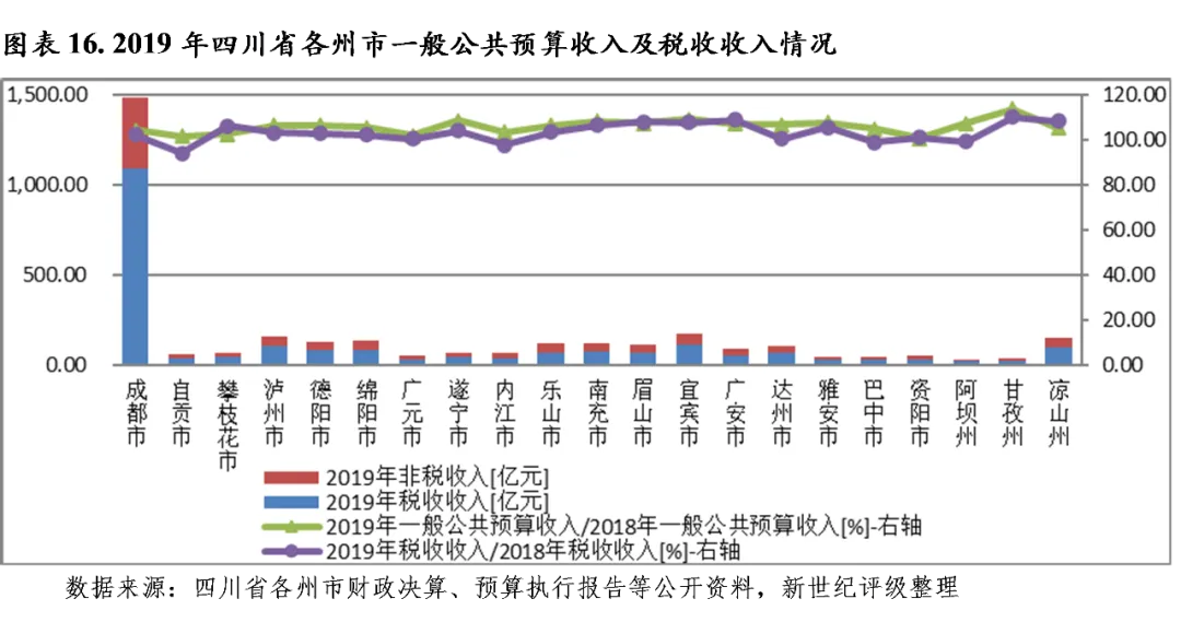 从下辖各州市情况看,2019年四川省各州市一般公共预算收入排序无变动,成都一般公共预算收入规模继续保持绝对优势,2019年为1482.96亿元;宜宾、泸州和凉山一般公共预算收入在150亿元以上,绵阳、德阳、南充、乐山、眉山和达州突破百亿;其余各州市一般公共预算收入规模较小。四川省每年获得大规模的上级补助收入,非成都地区一般公共预算财政平衡对上级补助收入依赖大,成都2019年一般公共预算自给率为73.9%,其余各州市均低于50%。税收方面,2019年大部分州市税收增速放缓,自贡、内江、巴中和阿坝税收收入下滑,降幅分别为6.11%、2.35%、1.29%和1.11%;受此影响,当年大部分州市税收比率均有所下降,总体仍处于相对较低水平,2019年税收比率高于70%的州市仅成都、雅安、攀枝花和阿坝;成都2019年税收收入是上年的102.2%,税收比率为73.6%。2020年前三季度,除广安、巴中、乐山和成都外,其余州市一般公共预算收入均实现增长,而广安和巴中分别以-9.7%和-6.6%增速分列各州市末两位,当期一般公共预算收入较明显下滑;成都当期实现一般公共预算收入1087.81亿元,增速为-0.8%。