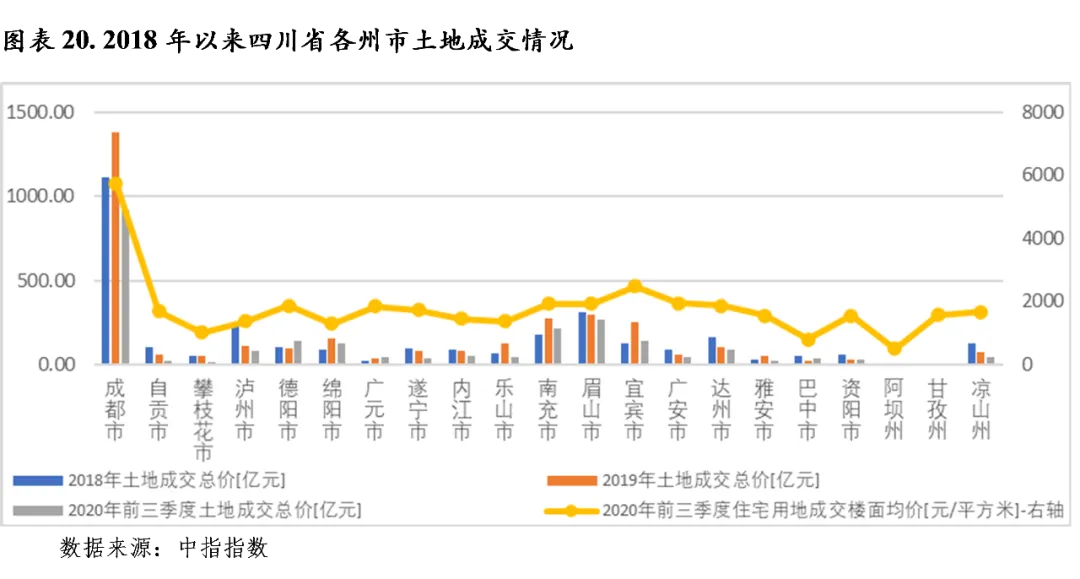 2020年前三季度,四川省大部分州市土地成交总价同比有所增长。从土地成交总价看,甘孜、巴中、德阳、广元和资阳2020年前三季度土地出让情况相对火热,当期土地出让总价已超过2019年全年规模;眉山、达州和绵阳当期成交规模已超过2019年全年的80%;而阿坝、乐山、攀枝花和雅安当期土地出让总价未达到上年全年规模的40%,区域土拍热度趋冷;成都2020年前三季度实现土地成交总价918.94亿元,同比增长4.6%,当期成交规模为2019年全年的66.5%。