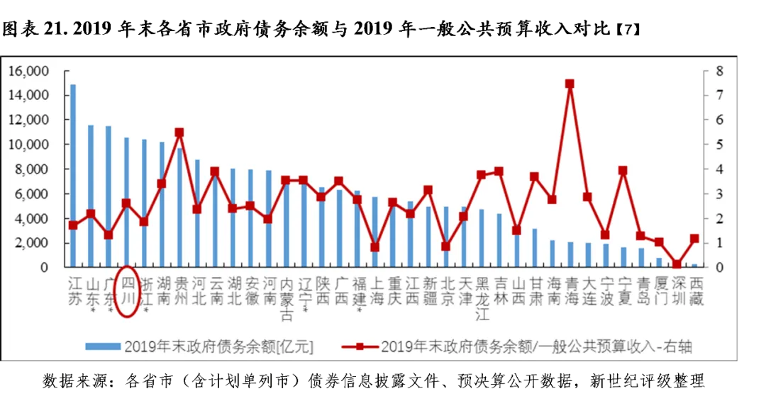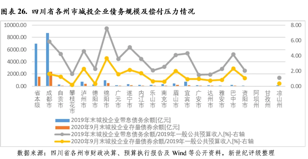 与财政收入规模相比,2019年末巴中、广元、资阳、内江、阿坝、甘孜和自贡政府债务偿付压力相对偏大,当年末政府债务余额分别为其2019年一般公共预算收入及政府性基金预算收入合计的365.6%、305.1%、260.2%、244.2%、233.3%、221.4%和205.0%;达州、攀枝花、广安、遂宁、南充和雅安政府债务偿付压力次之,当年末该比率均大于150%;省本级、眉山和成都政府债务偿付压力相对较小,2019年一般公共预算收入及政府性基金预算收入合计能覆盖当年末政府债务余额,其中成都该比率为93.1%。
