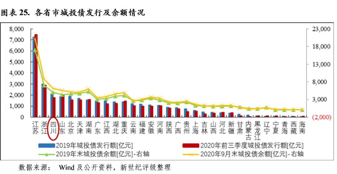 根据《关于四川省2020年财政预算调整方案的报告》,经国务院批准,财政部核定,2020年四川省政府债务限额为14053 亿元,较2019年新增债务限额2322亿元。2020年前三季度,四川省累计发行地方政府债券3329.29亿元,其中新增债券2315.8亿元(含项目收益与融资自求平衡专项债券1840亿元)、再融资债券1013.49亿元。截至2020年9月末,四川省地方政府债券余额(含代发债券)为12845.48亿元,占2020年四川省政府债务限额的91.4%,年度内仍有发行空间。
