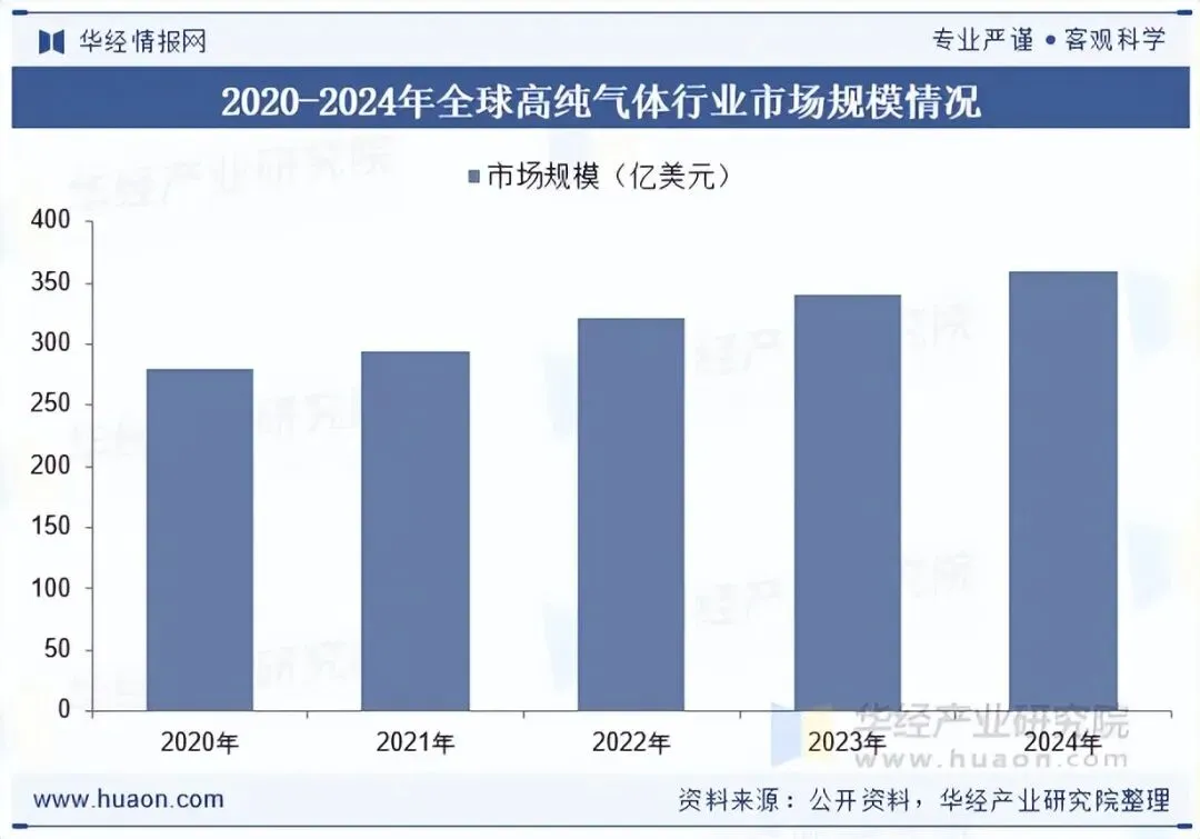 随着下游半导体及其他高科技行业的快速发展与成熟,相关企业对气体纯化器和气体过滤器的性能要求也逐步提高。经过多年积累,行业已形成了一系列具备较强行业竞争力的核心技术企业,成熟应用催化、吸附、吸气剂等各类核心工艺,能够及时根据下游行业需求,提供富有行业竞争力与技术实力的产品。据统计2024年全球高纯气体市场规模约为360亿美元,2020-2024年CAGR约为6.5%。