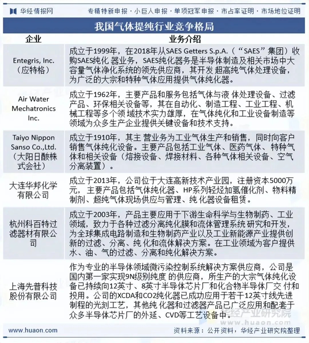 我国高纯气体纯化设备行业高端市场长期由国际企业巨头占据,应特格(Entegris)、Air Water Mechatronics Inc、大阳日酸(Taiyo Nippon Sanso)等国际行业巨头依托深厚的技术积累、产品高性能和高品质及使用广泛性在竞争中处于优势地位。特别在半导体制造的多个环节,在全球及中国都有较高的占有率和良好的口碑。国内企业基于长期的研发和技术积累,在纯化技术、产品质量及服务等方面对国际巨头进行加速追赶。