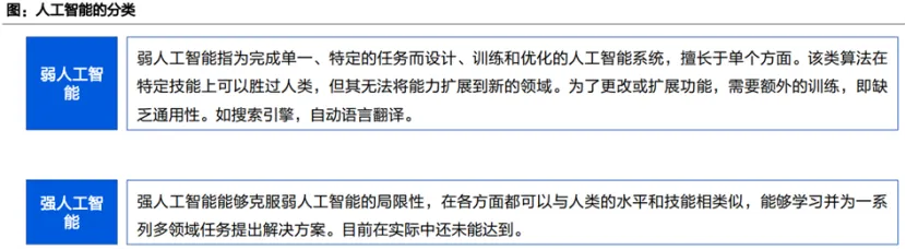 人工智能可以被划分为两个类别,即弱人工智能(Artificial Narrow Intelligence,ANI)与强人工智能(Artificial General Super Intelligence,AGI),弱人工智能只能完成单一、特定的任务,而强人工智能可以在各方面与人类的技能相类似。
