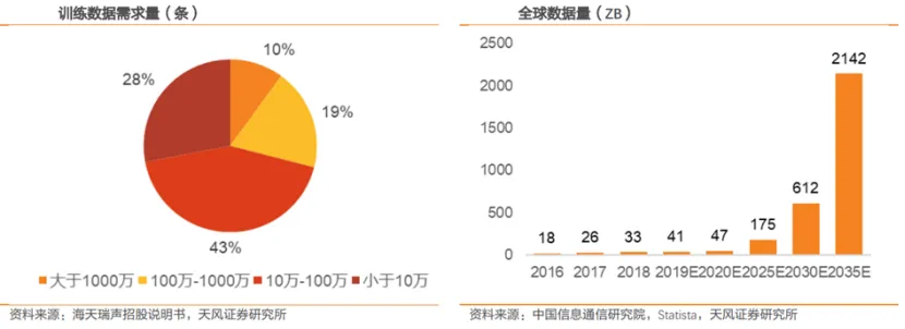 深度学习算法是推动人工智能技术突破性发展的关键技术理论,大量训练数据的训练支撑是深度学习算法的基础。训练数据越多、越完整、质量越高,模型推断的结论越可靠。根据Dimensional Research的全球调研报告,72%的受访者认为至少使用超过10万条训练数据进行模型训练,才能保证模型的有效性和可靠性。根据中国信通院数据,到2035年,全球数据量将达2142ZB,是2020年数据量的45-46倍。数据量的指数级增长有望为人工智能产业发展提供“燃料”。