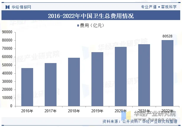 2022年我国卫生总费用80528亿元,占GDP的6.82%。未来,随着我国经济的不断发展,居民收入水平的提升,以及国家医疗保险制度的不断完善,我国医疗卫生消费市场规模也随之迅速扩张,在我国日益增长的医疗卫生消费市场规模下,中医药行业也将迎来更加广阔的发展空间。