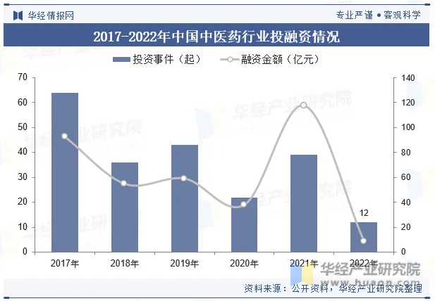 2021年中国中医药市场共发生39起投资事件,投资金额达117.62亿元。2022年投融资事件12起,融资金额达8.29亿元,中医药行业的投融资热度有所下降,这可能是由于政策环境的变化、市场竞争的加剧以及行业发展的不确定性等因素导致的。但对于长期投资者而言,中医药行业仍然具有巨大的发展潜力,尤其是在健康消费升级、人口老龄化等背景下,中医药行业的市场需求将持续增长。