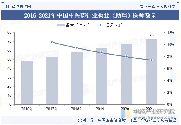 强化中医药人才培养是推进中医药发展的重要一环。从2015-2020年的复合增速数据可以看出,中医药从业人员复合增速较执业(助理)医师增速高出1.3%,而在中医药人员增速主要系中医类执业(助理)医师贡献力量,其15-20年复合增长达8.6%,高于执业(助理)医师复合增速(6.1%),数量从2010年的29.4万人上升到2021年的73.2万人。随着国家推动中医医疗机构的配置,中医药人才有望呈现加速增长态势,为行业新增中医医疗机构提供劳动力资源。