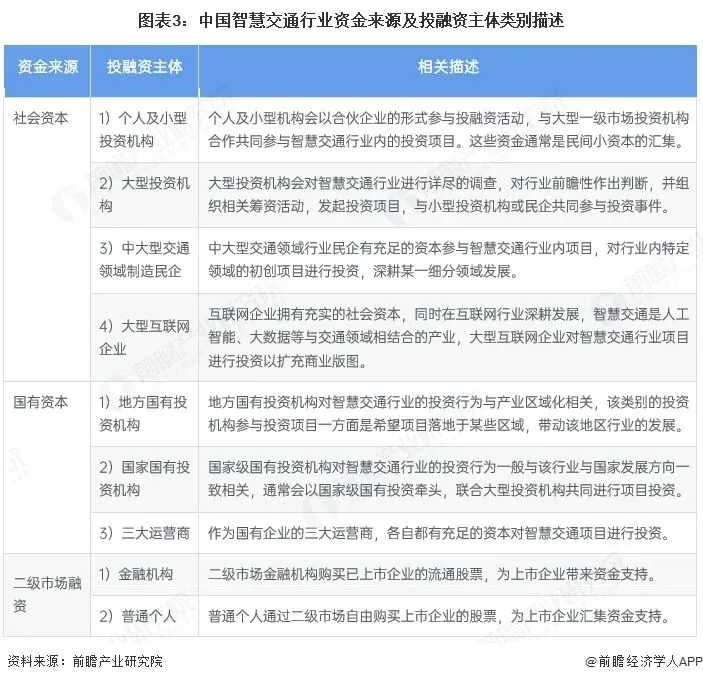 智慧交通行业资金来源主要分为社会资本、国有资本和上市融资,参与投融资主体一般有个人、小型投资机构、大型投资机构、中大型民企、地方及国家国有投资机构,二级市场投资主体一般是金融机构或者普通个人。
