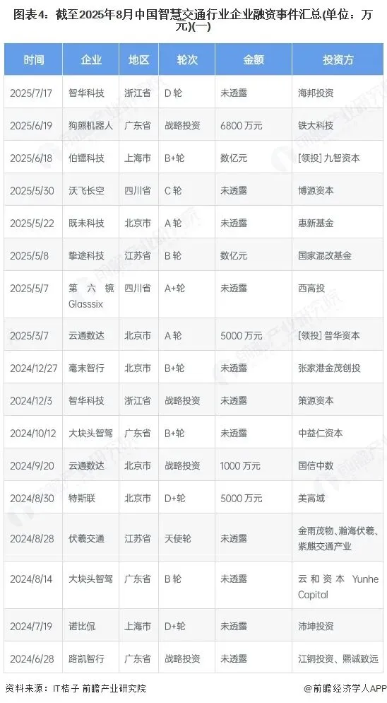 截至2025年8月的智能交通领域投资呈现三大特征:一是技术聚焦智能网联与自动驾驶,挚途科技、毫末智行等企业在车路协同、L4级自动驾驶等核心技术领域获资本青睐,反映行业向高阶智能化演进的趋势;二是地域集中效应显著,长三角与珠三角合计占比超70%,与国家智慧交通一体化示范区建设形成共振;三是资本结构呈现"国家队+市场化"双轮驱动,国企资本与专业风投形成互补,战略投资占比较高,凸显产业链整合与场景落地需求。值得关注的是,2024年开始B轮以上投资事件增多,显示行业进入快速成长期,技术成熟度与商业化能力成为资本筛选关键。