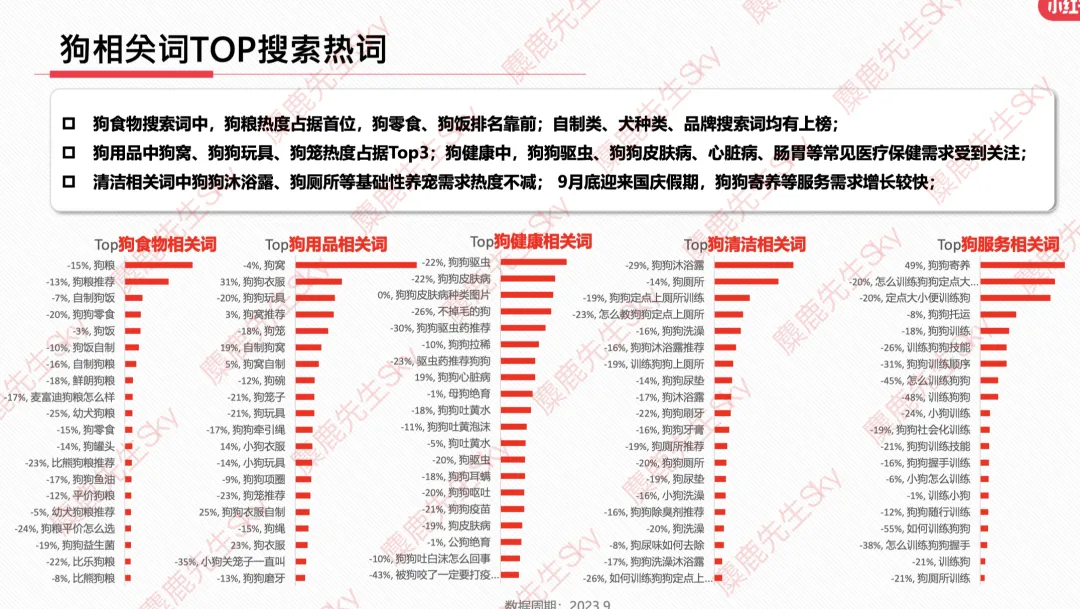 在搜索词上来看,宠物的食品需求占据的比例最大,其次是宠物相关的健康产品,最后才是娱乐产品或洗护产品,但猫狗略有差异的是,狗的服饰类产品排名靠前,但猫的服饰类占比非常小,这点很值得关注。