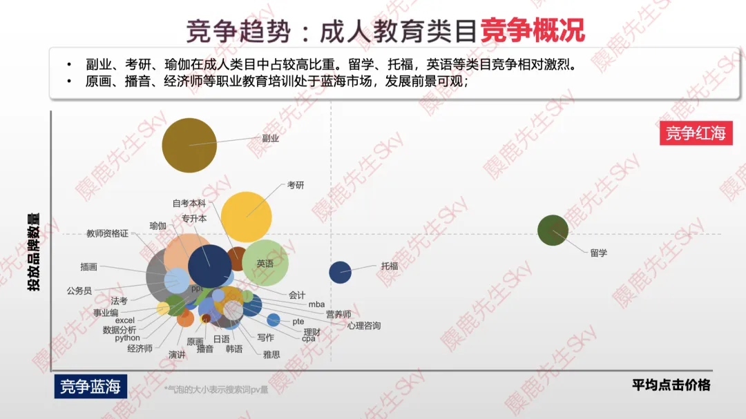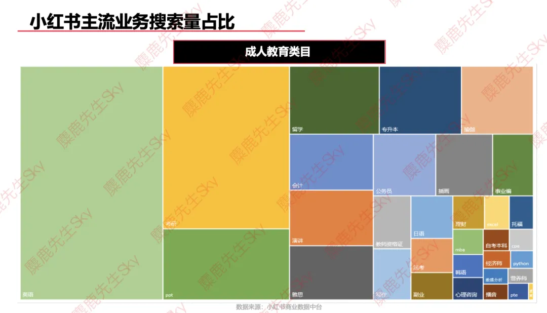 成人教育细分下来,英语占比最高,其次是考研,紧接着是ppt,留学,大多数都是以学生为主,可见成人教育里,还是在学生时代,最有需求。