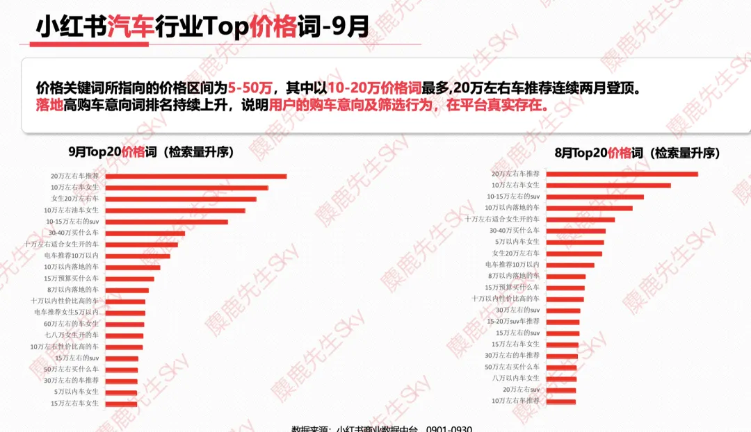 在检索价格上,价格区间为5-50万元,其中10-20万较为领先,这也说明了小红书的消费能力还是较强的。