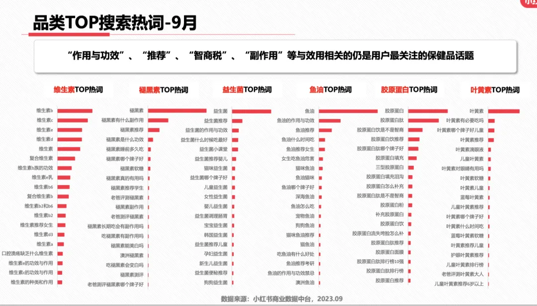 从成分的角度做细分类,排在前几的成分是维生素、鱼油和益生菌,按照功效来划分,减肥排名靠后,皮肤管理升至第一位。