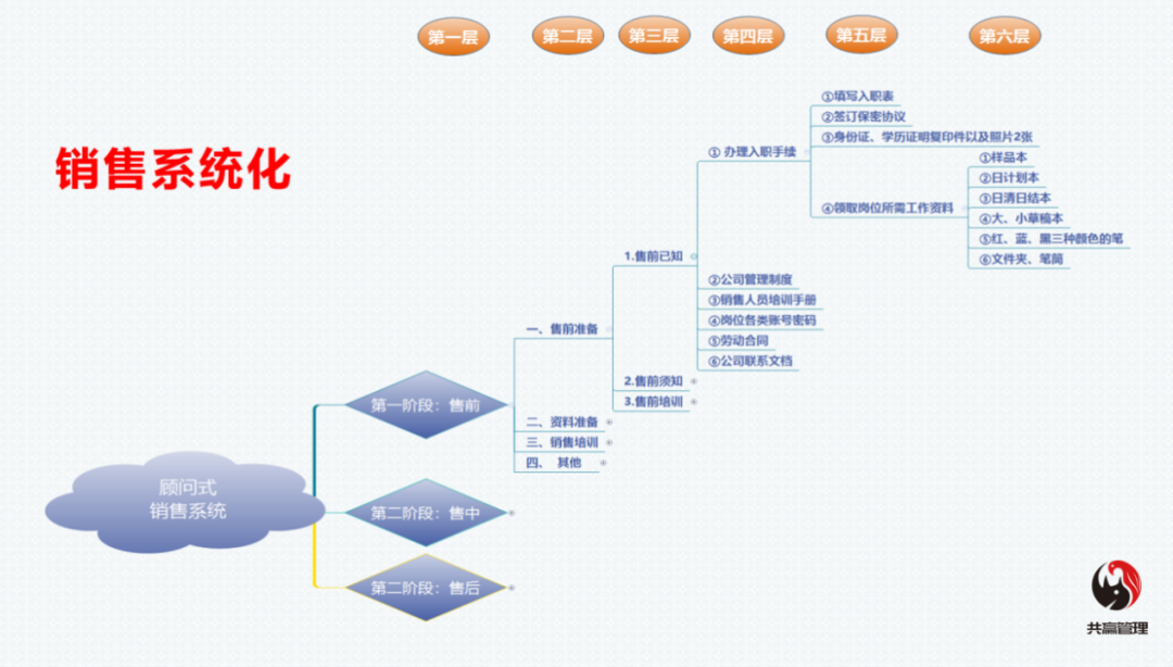 前几年,我辅导一家年销售只有千万的企业,帮助他们完善了销售系统,分成售前、售中、售后三个系统,大家可以看文稿中的图。