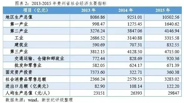 贵州省2013-2015年地区生产总值增速分别为12.5%、10.8%和10.7%,增速高于全国水平。产业结构方面,第二、三产业增加值占地区生产总值比重不断提高,2015年达到了84.38%。2015年,贵州省人均生产总值达到29847元。