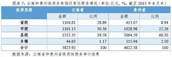 2014年1月24日,云南省和贵州省分别公告了《云南省政府性债务审计结果》和《贵州省政府性债务审计结果》,统计时间截至2013年6月,通过分析云南省和贵州省负有偿还责任债务的构成,可以看到: