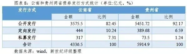 按发行方式分,云南省公开发行3575.5亿元,定向发行444亿元,私募发行317亿元,其中公开发行占比为82.45%。贵州省公开发行5451.72亿元,定向发行389.68亿元,私募发行73.5亿元,其中公开发行占比为92.17%。云南和贵州两省债券发行均以公开发行为主。