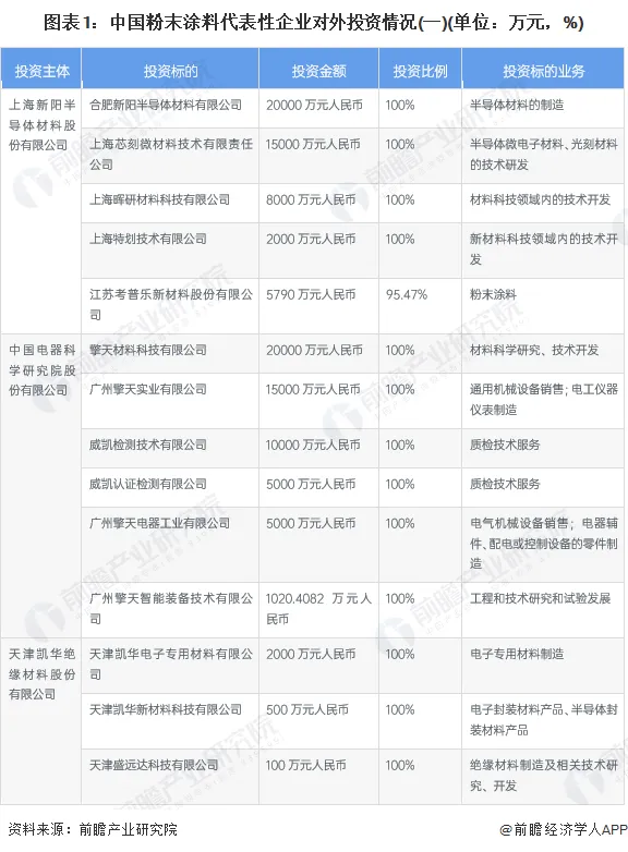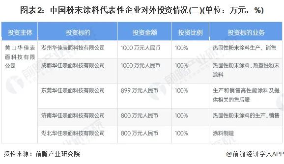 从中国粉末涂料代表性企业的对外投资来看,粉末涂料企业对外投资的企业数量较多,多以设立子公司经营地区业务,同时顺应时代发展新趋势,开拓包装设计服务及智能包装技术服务等。
