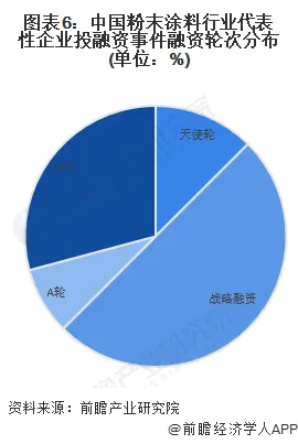 中国粉末涂料行业投融资事件主要集中在战略融资,其中获取融资的企业从事的业务主要是粉末涂料生产制造企业以及用以生产粉末涂料的环氧树脂、聚酯树脂等材料的制造商。