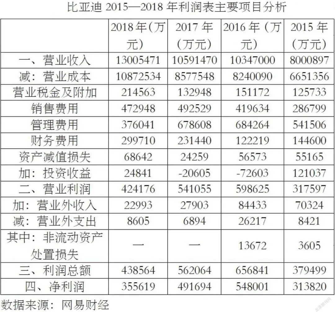 该部分对比亚迪利润表进行分析。本文的数据主要选取自2015年至2018年利润表中的主要项目。通过对比2015年至2018年的数据,了解比亚迪近四年的财务状况变化情况,对其变化趋势进行深入剖析。