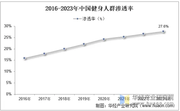 根据数据显示,中国健身市场渗透率逐年提升,2022年中国健身人群渗透率(指健身人群占中国总人口的比例)为26.5%。据预计我国2023年的健身人群渗透率为27.6%,将增长1.1个百分点。