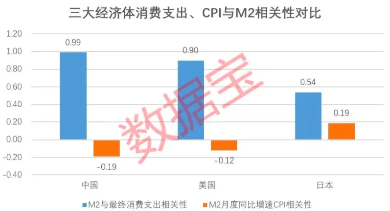 同时,数据宝根据过去20年M2(广义货币供应量)与历年的最终消费支出对比观察到,中、美两国的数据正相关性较强,即超发货币之下消费支出会有相应增加;但日本这两者之间相关性较弱。