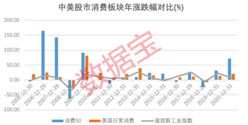 数据宝统计显示,近10年(2012.6.14-2021.6.15)时间,中国消费50指数涨幅高达211%,远超过同期沪深300指数、纳斯达克指数表现,而美国日常消费股近10年平均涨幅为118%。2008年受金融危机影响,全球股市普遍大跌,但2009年中国消费50指数涨幅超90%,超过美国日常消费股平均涨幅。