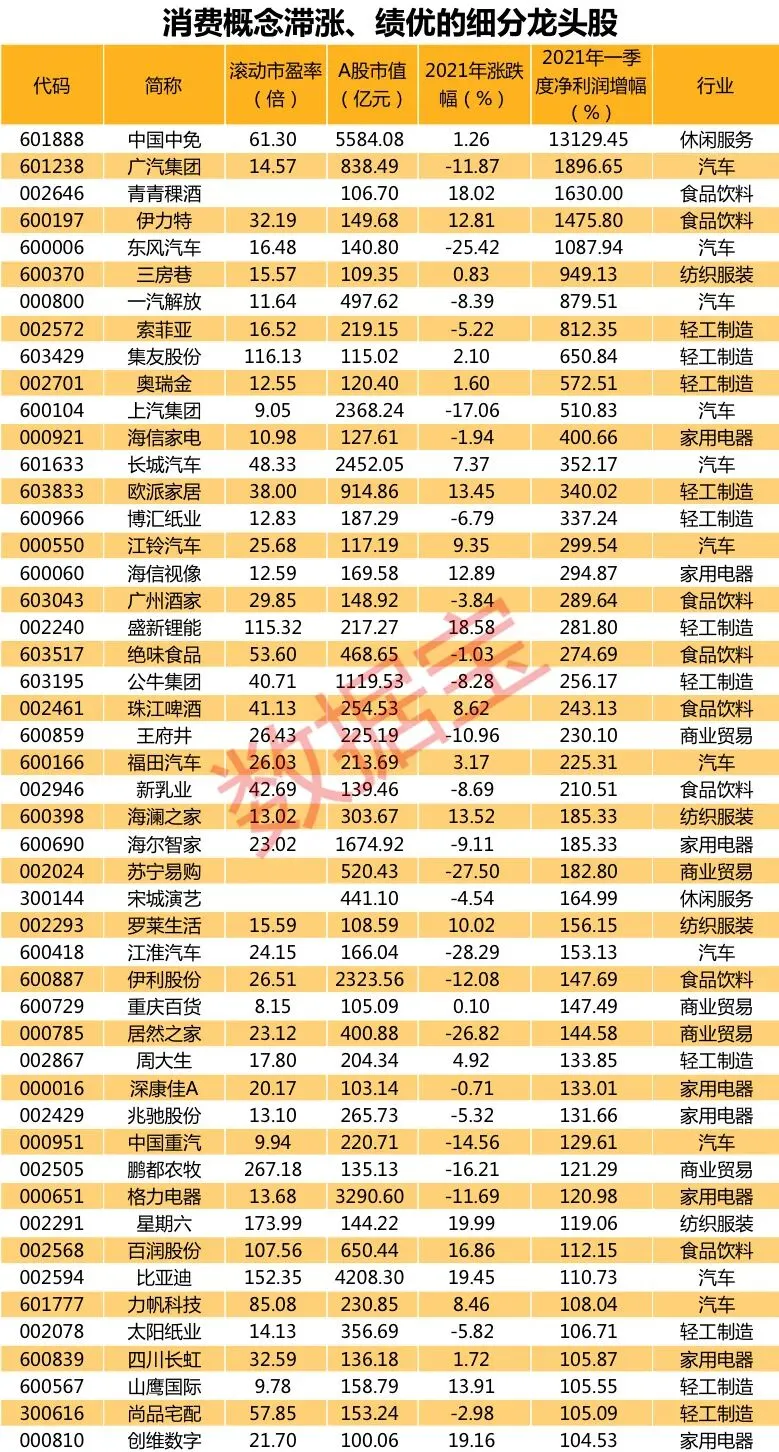 数据宝统计了A股的消费概念股,共计591股,包括食品饮料、商业贸易、休闲服务、纺织服装、家用电器、轻工制造、汽车行业中的乘用车整车股等。591只消费概念股包括白酒龙头贵州茅台、免税龙头中国中免、家电龙头美的集团、汽车龙头比亚迪等,最新市值合计14.47万亿,其中贵州茅台、五粮液市值超万亿。591股中市值过百亿的上市公司有161家,基本上属于各细分行业的龙头,是主力资金重点关注的标的。
