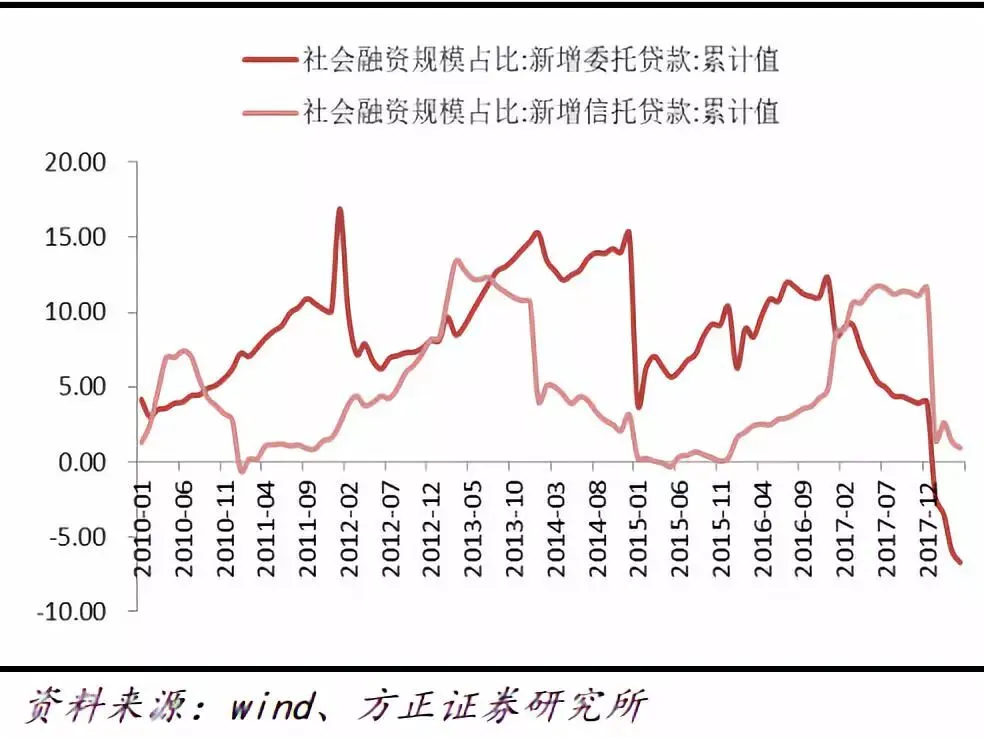 2014-16年:大资管行业兴起,取代信托。券商资管和基金子公司加强同银行在非标领域的合作,且资管和基金子公司不受银监会监管,从某种意义上来说替代了信托通道的作用,导致这三年新增委托贷款规模显著高于信托借款,占社融比也分别达到:15%、10%、12%,显著超越新增信托贷款占比(3%、0%、5%),因此可以看到2010年以来,信托借款和委托贷款的增速持续处于背离态势,说明一定程度上,两者在不同的监管政策下有一定替代作用。
