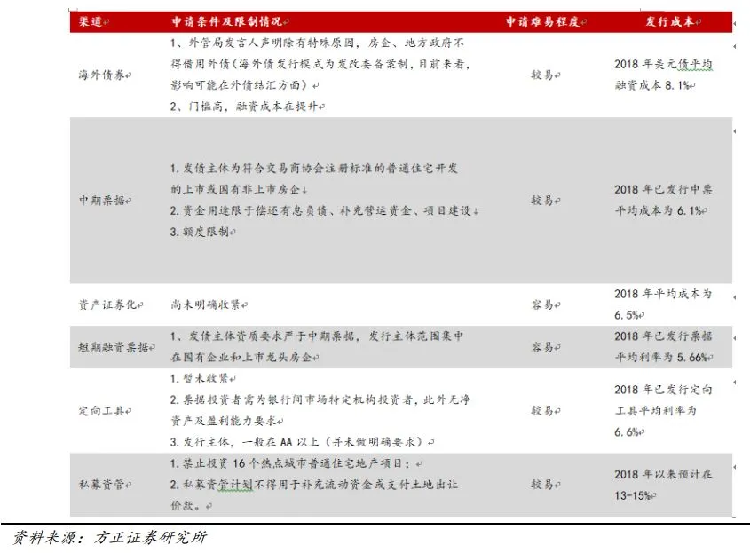 总结来看,自2016年“930”新政以来,银行贷款、公司债、房地产信托、私募资管、股权融资等均受到严格监管。从各渠道融资申请难易程度上来看,目前海外债、短期融资、中期票据、定向工具、ABS发行难度较低;房地产开发贷、公司债、非标融资发行难度较大;IPO、定向增发已基本停滞。