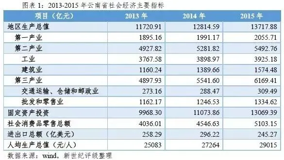 近年来云南省经济保持增长态势,2013-2015年地区生产总值增速分别为12.1%、8.1%和8.7%,虽然增速有所放缓,但仍高于全国平均水平。产业结构由上年的15.5:41.2:43.3调整为15:40:45,产业结构不断优化。2015年云南省人均地区生产总值达到29015元,比上年增长8.1%。