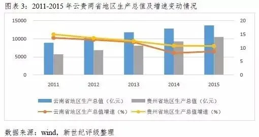 从全国范围来看,2011年以来,我国经济在保持增长的趋势下,承受了较大的下行压力,2015年经济增速有所回升,大部分省市经济数据亦有所好转。2015年云南省和贵州省的地区生产总值在全国的排名均靠后,但两省的地区生产总值增速相比全国其他省市较高。其中,贵州省的地区生产总值增速超过10%,仅低于重庆和西藏。云南省的地区生产总值增速为8.7%,在全国31个省级行政区中也排在前列。