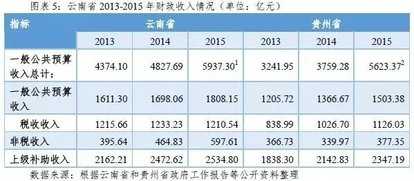 云南省2013-2015年一般公共预算收入增速分别为20.4%、5.38%和6.48%。2013年一般公共预算收入增速显著高于全国平均水平,但2014年,由于以资源型、重化工为主的产业结构在宏观经济下行压力下的税源支撑弱化,全省一般公共预算收入增速出现明显回落。近年来贵州省处于经济快速发展阶段,“开放、改革和转型”的成果正逐步体现,随着省内传统产业转型的推进、以大数据、大健康等为主的新兴产业的引进和培育,贵州省一般公共预算收入呈现较快增长态势,后发优势明显。2014和2015年一般公共预算收入增速分别为13.35%和10.00%,虽然2015年增速有所下降,但仍高于全国一般公共预算收入增幅。