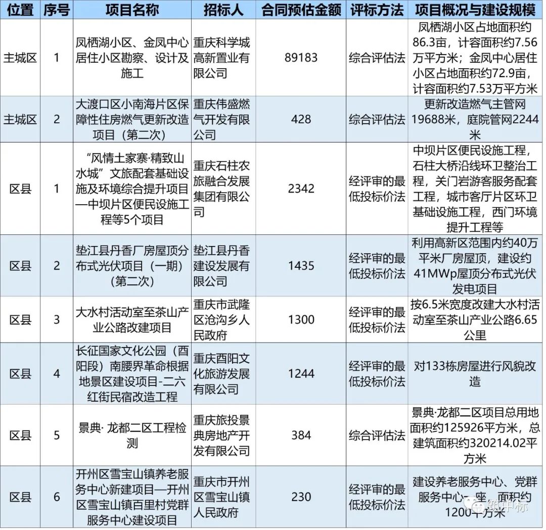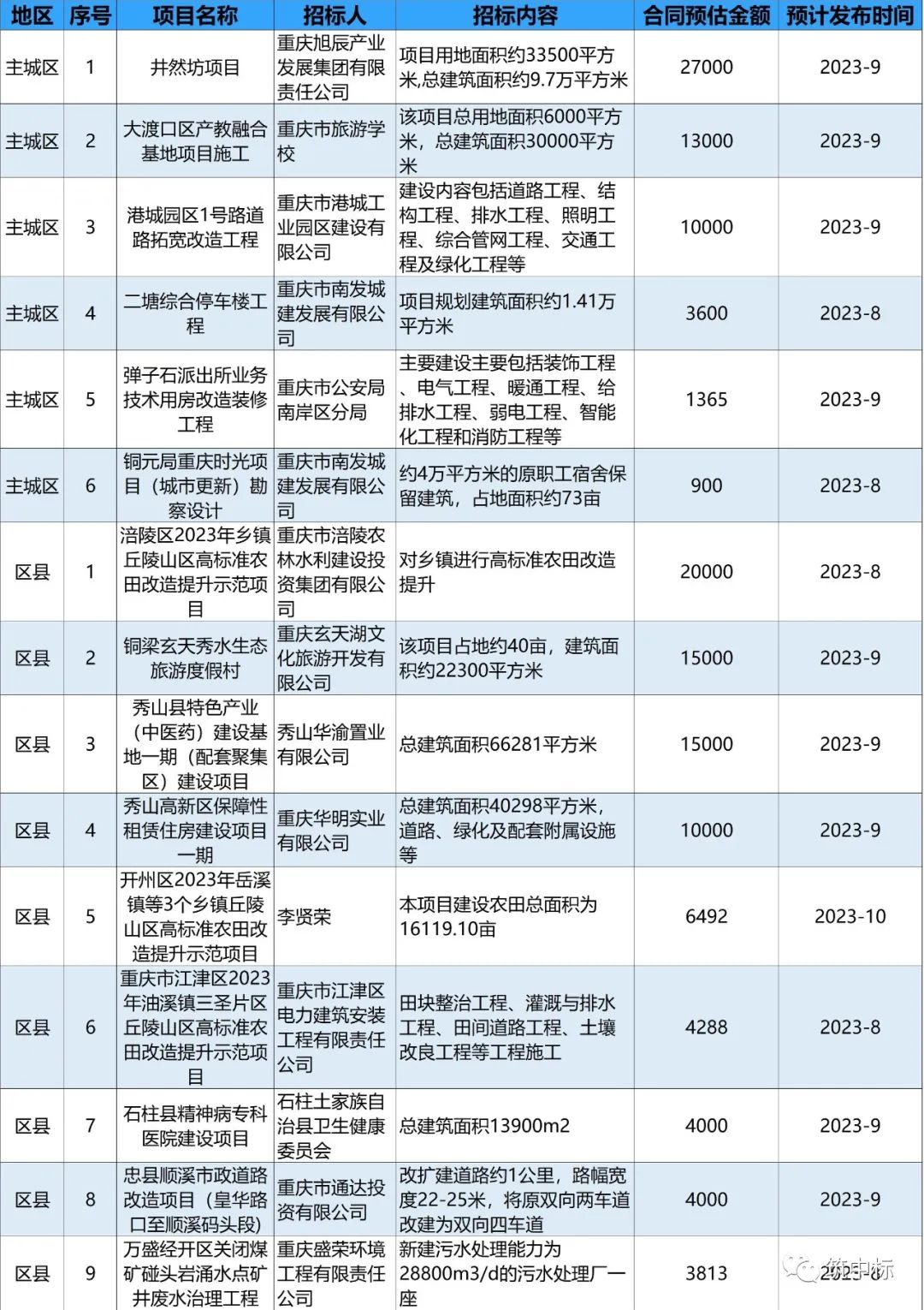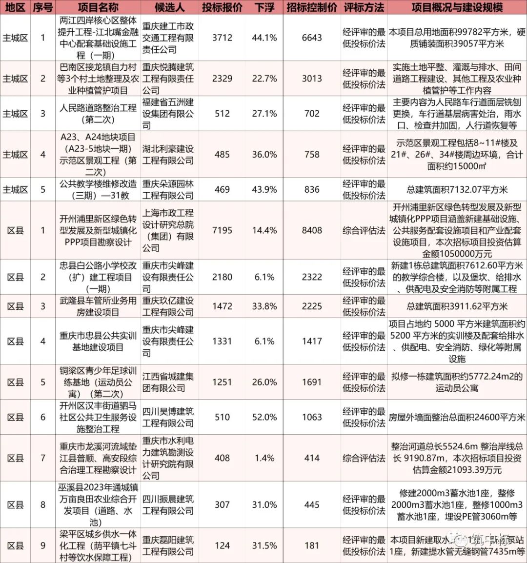 今天是2023年8月17日,下面是最新的工程建设类招标计划简讯,招标计划全市总计15条,主城区6条,周边区县9条。项目合同预估金额大于1亿的有7个,主城区3个,区县4个。1000万-1亿的有7个,主城区2个,区县5个。下面是最新的工程建设类招标公告简讯,招标公告信息全市总计8条,主城区2条,周边区县6条。项目合同预估金额大于1亿的有1个,主城区1个,区县0个。1000万-1亿的有4个,主城区0个,区县4个。其中采用“综合评估法”的项目有3个,采用“经评审的最低价投标法”的项目有5个。下面是最新的工程建设类中标候选人公示简讯,中标候选人公示信息全市总计14条,主城区5条,周边区县9条。
