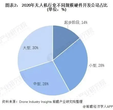 硬件部分的投资额在2020年增长较快,达到了20亿美元。与2019年相比,无人机行业软硬件的投资差额由2019年的1.59亿美元扩大到了2020年的19亿美元。从相关领域公司的发展情况来看,中大型无人机硬件开发公司在所有无人机硬件开发公司的占比中占到了58%。